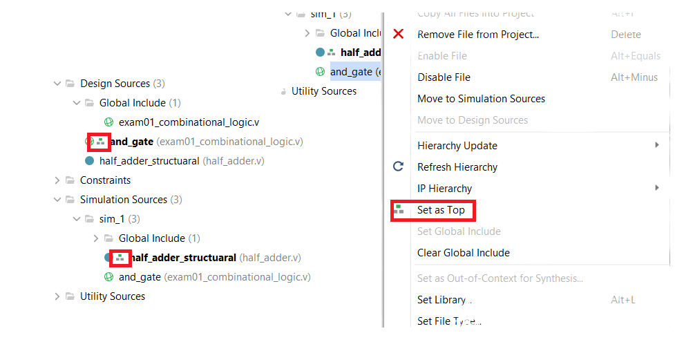 상위 파일을 설정해준다. _ Simulation은 top source를 기준으로 실행된다.
