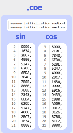 - 생성 예시 파일: sin_lut.coe, cos_lut.coe