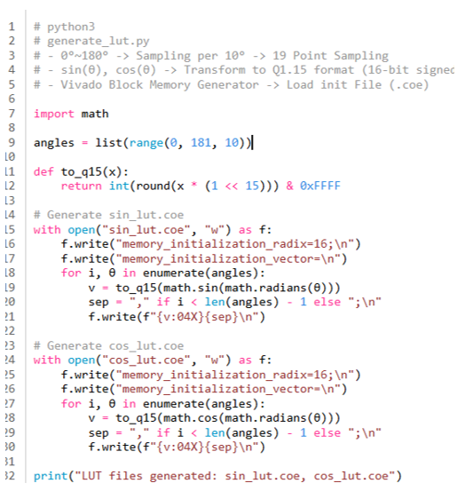 - FPGA 메모리 IP에서 사용할 사인/코사인 값(.coe 파일) 을 자동 생성