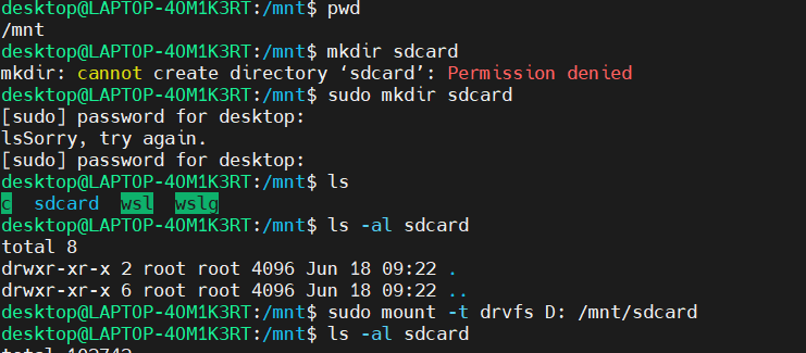 SD카드 수동 마운트 하기mount 하려는 디렉토리 생성sudo mkdir /mnt/sdcard디렉토리의 생성 후 drvfs를 이용하여 마운트를 진행sudo mount -t drvfs D: /mnt/sdcard수동으로 마운트를 해제하려면 아래의 명령을 이용합니다. (마운트 위치의 파일이 사용중이거나, 현재 위치가 마운트 위치가 아니어야 합니다)sudo umount /mnt/sdcard커널 컴파일 환경 구축하기컴파일에 필요한 파일 설치sudo apt-get updatesudo apt-get upgradesudo apt-get install -y git bc bison flex libssl-dev make libc6-dev libncurses5-dev \\ crossbuild-essential-armhf//..